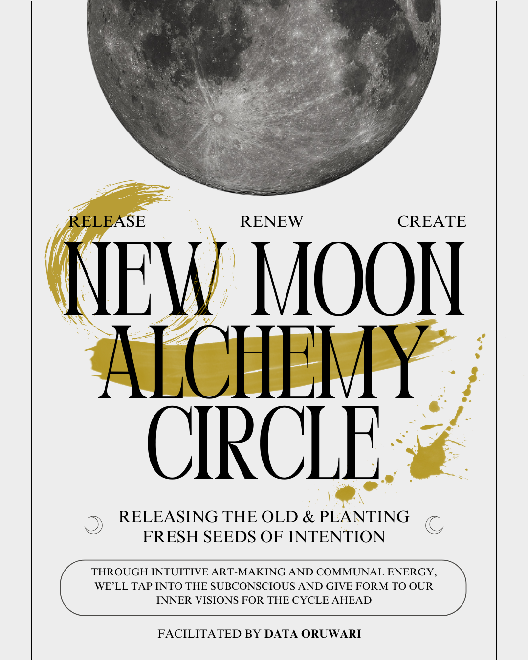 The new moon is a portal of transformation, a time to surrender the old and welcome fresh beginnings. Together, we will align with the energy of the new moon to release what no longer serves us, clear space within and plant new seeds of intention. Through intuitive art-making and communal energy, we’ll tap into the subconscious and give form to our inner visions for the cycle ahead. This is a moment for reflection, renewal, and creative manifestation where the unseen takes shape and our intentions are infused with life.